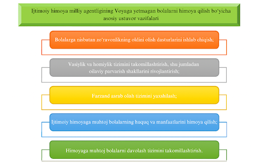 Bundan tashqari, bolalarni zoʻravonlikdan himoya qilishga qaratilgan tizimlar ham ishlaydi. Shular orasida bugun eng samarali ishlayotgan tashkilotlardan biri Ijtimoiy himoya milliy agentligidir.