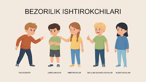 Bezorilik (bulling) holatida asosan 5 ta toifadagi ishtirokchi bo‘ladi. Bular: