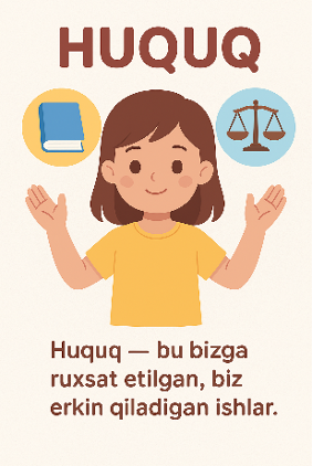 Aziz bolalar, sizlarning har biringizning huquqlaringiz bor. O‘qish, o‘ynash, mehr ko‘rish – bularning barchasi sizniki! Lekin huquq bilan birga burch ham bor. Huquq va burchni birga bajarsakkina baxtli inson bo‘lamiz.