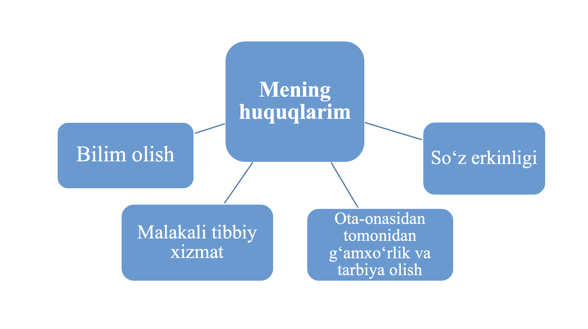 Har birimizning huquqlarimizni himoya qilish uchun davlatimiz yetarli shart-sharoitlarni yaratgan. Masalan, xavfsizlik huquqimizni ta’minlash uchun ichki ishlar xodimlari, ta’lim huquqimizni ta’minlash uchun maktablar, sog‘lom hayot huquqimizni ta’minlash uchun poliklinika va shifoxonalar qurgan, to‘g‘rimi?