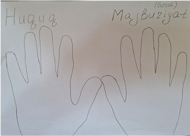 Endi esa daftarlarimizning o‘rtasidan 2 varaq olamiz. Bir tomoniga o‘ng qo‘lingizni, ikkinchi tomoniga chap qo‘lingizni qo‘yib, chizib oling. O‘ng qo‘lingiz tepasiga mening burchlarim deb yozing. Chap qo‘lingizni tepasiga mening huquqlarim deb yozing. Endi “Huquq” deb yozilgan qo‘l barmoqlariga huquqlaringizni, “Burch” deb yozilgan qo‘l barmoqlariga majburiyatlaringizni yozing. Endi bolalar diqqat bilan eshiting!