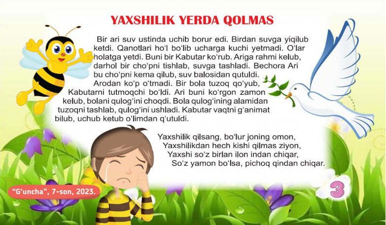 Bolajonlar, kelinglar hozir men sizga Abdulla Avloniyning “Yaxshilik yerda qolmas” hikoyasini o‘qib beraman. Hikoya “G‘uncha” jurnali 2023-yil, 7-sonida berilgan.