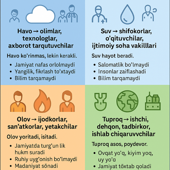 Havo → olimlar, texnologlar, axborot tarqatuvchilar. Havo ko‘rinmas, lekin kerakli. Fan, ilm, bilim ham ko‘zga tashlanmaydi, lekin jamiyatni rivojlantiradi. Agar biz bo‘lmasak… jamiyat nafas ololmaydi. Yangilik, taraqqiyot, fikrlash to‘xtaydi. Bilim tarqamaydi. Hayot qotib qoladi. Fikrsiz jamiyat – havosiz tabiat.